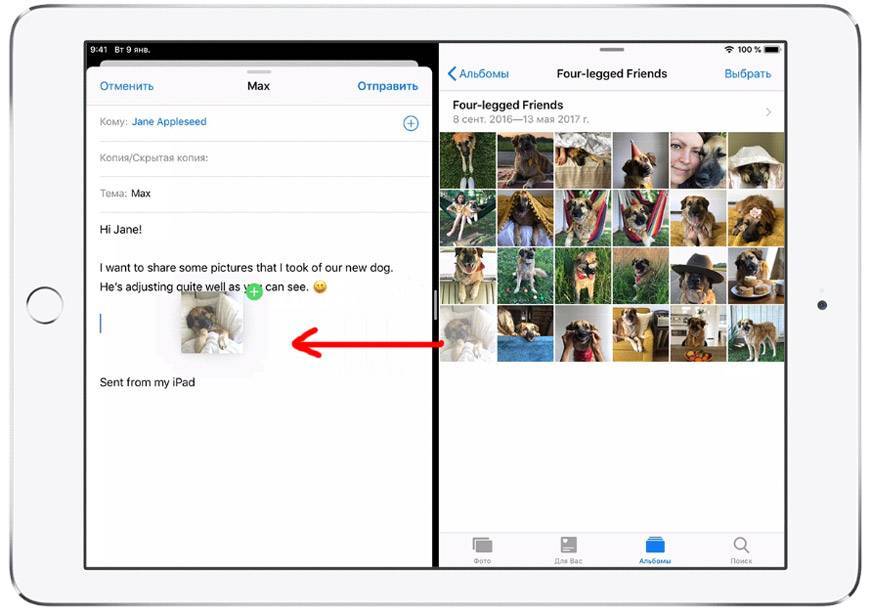 Этот режим позволяет перетаскивать файлы, текст, видео между открытыми окнами. Например, можно в почте писать письмо, а со второго окна перетаскивать фотки. Или из браузера Safari копировать информацию с какого-либо сайта в блокнот.