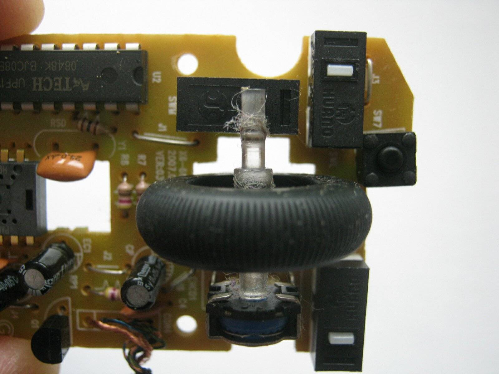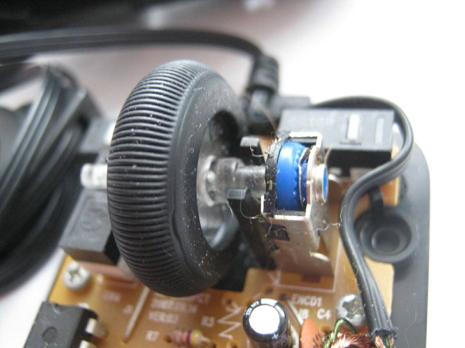 Над схемой не проводим никакой диагностики для элементов электроники (диагностика проводится в крайнем случае). На двух фотоснимках (фото 2) в увеличенном плане видно колесико с осью, передающее сигнал своего вращения схеме. В правом фотоснимке, на двух концах оси колесика можно заметить мелкие фрагменты волоса, ворса и пыли. Ватной палочкой аккуратно удаляем мелкие фрагменты ворса и пыли, если какие то соринки удаляются плохо, — используется пинцет.