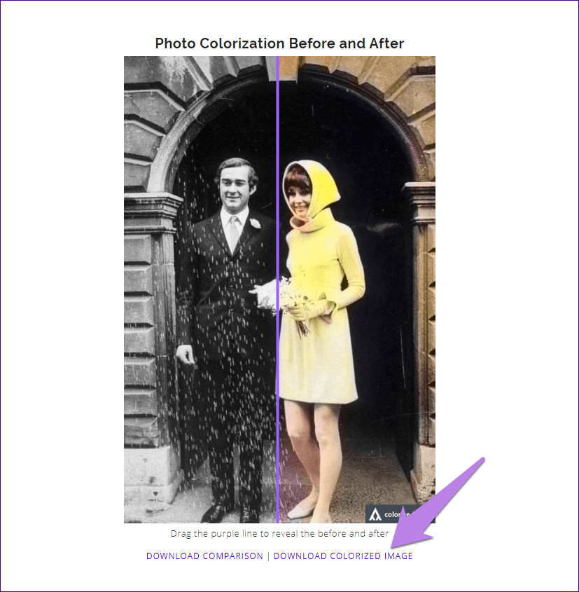 По завершении процесса вы увидите, что только половина вашего изображения раскрашена. Это не так. Сайт делает это, чтобы вы могли сравнить фотографии до и после. Перетащите ползунок посередине в левую сторону, чтобы просмотреть полностью цветное изображение.