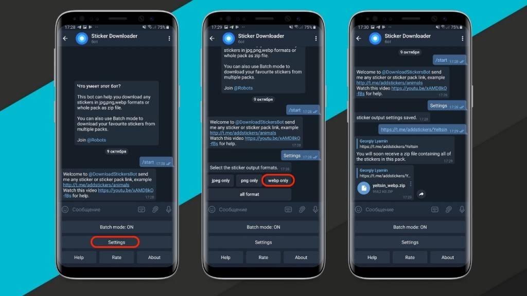 - Дальше придётся воспользоваться помощью бота — Sticker Downloader.