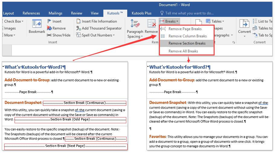 | В Word, чтобы удалить разрывы страниц или разделов, вы просто можете удалить их по одному вручную или использовать код VBA, который тратит впустую время. Но утилита Breaks от Kutools for Word может быстро удалить разрывы страниц, разрывы столбцов, разрывы разделов или все разрывы в выделении (ах) или во всем документе одним щелчком мыши. Нажмите, чтобы получить 60-дневную бесплатную пробную версию! |