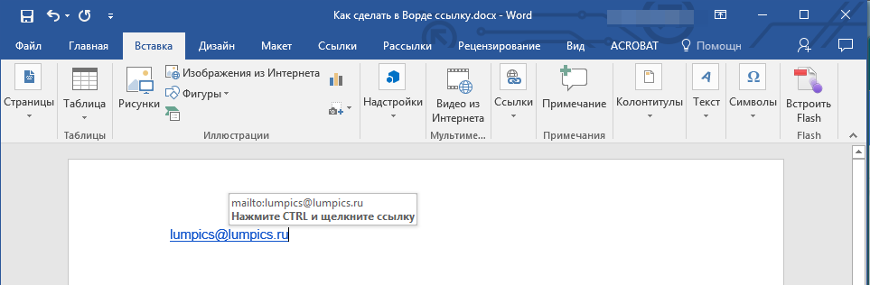 Кроме того, вы можете создать гиперссылку на пустое электронное сообщение, введя в документе адрес почты. К примеру, если ввести “lumpics@lumpics.ru” без кавычек и нажать пробел или “Enter”, автоматически создастся гиперссылка с подсказкой по умолчанию.