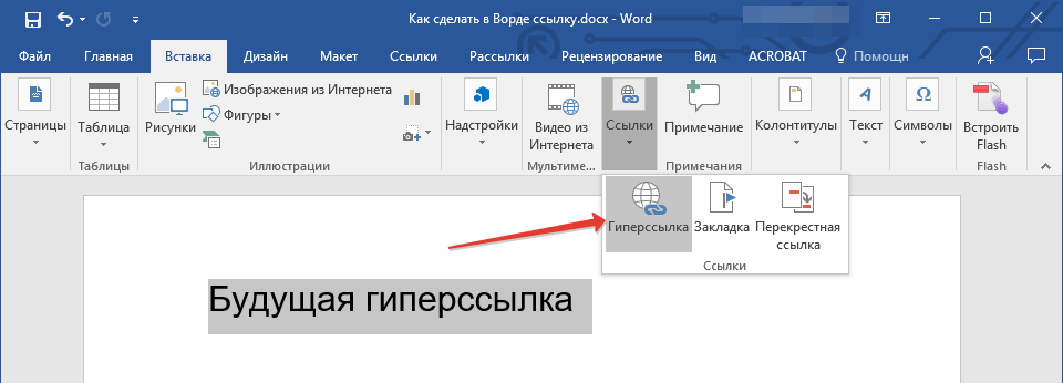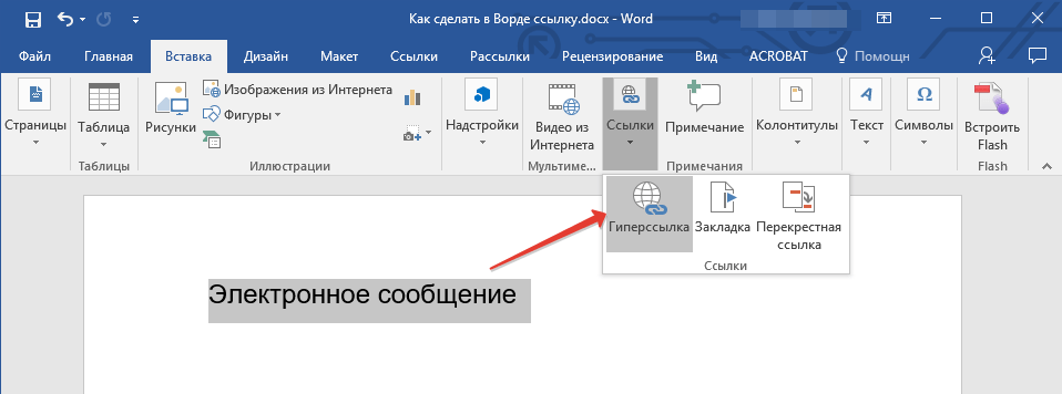 2. Перейдите ко вкладке “Вставка” и выберите в ней команду “Гиперссылка” (группа “Ссылки”).