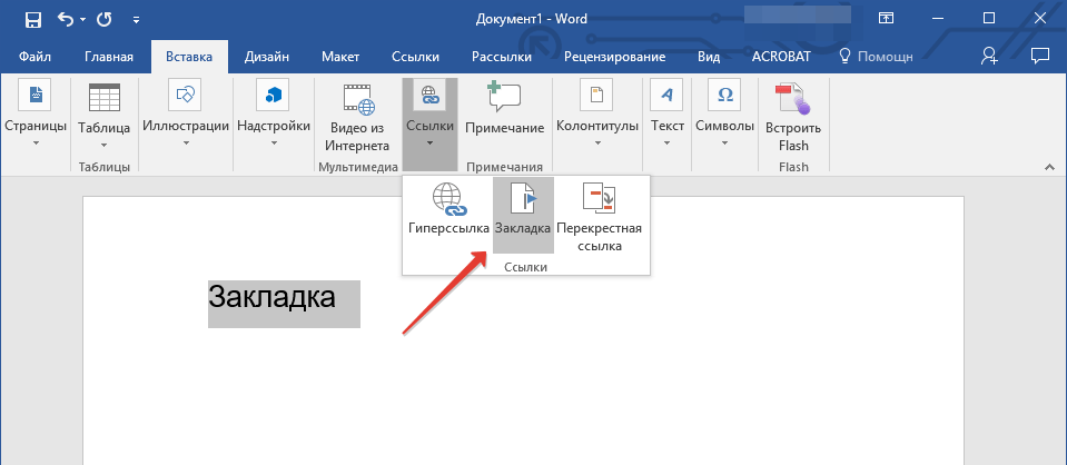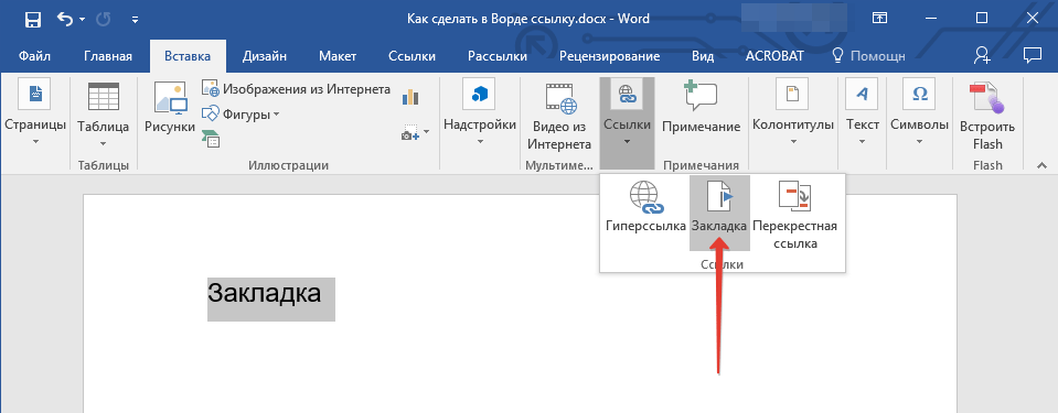 2. Перейдите ко вкладке “Вставка”, нажмите кнопку “Закладка”, расположенную в группе “Ссылки”.