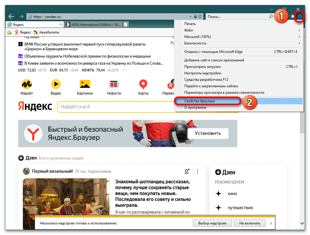 - В таком случае закройте все программы из пакета MS Office и запустите Internet Explorer. Когда веб-обозреватель откроется, нажмите на шестерёнку и перейдите в «Свойства обозревателя».