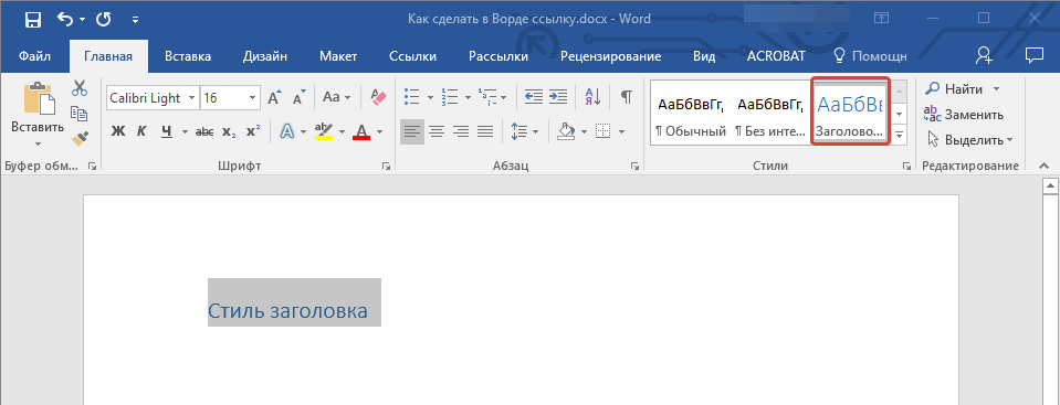 К тексту, расположенному в том месте, куда должна вести гиперссылка, можно использовать один из шаблонных стилей заголовков, доступных в MS Word.