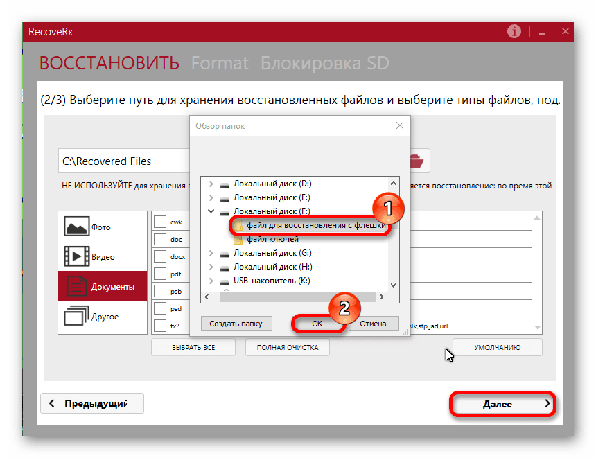 Выбираем папку для сохранения восстановленных документов, и жмём «ОК» затем «Далее».