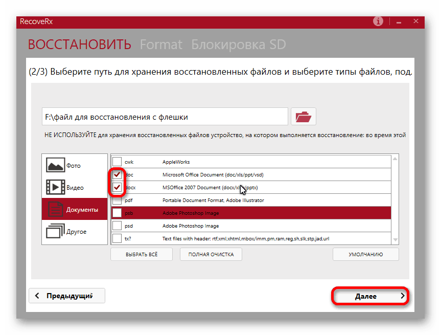 Отмечаем тип документа или несколько файлов, которые нужно восстановить.
