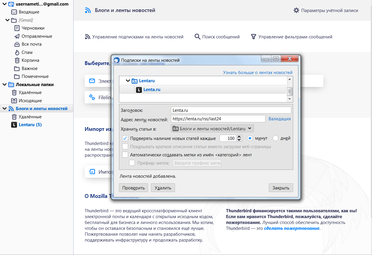 Mozilla Thunderbird поддерживает функцию подписки на RSS-ленту. Найдите в сети RSS-адрес нужного новостного портала, после чего зайдите на главной странице приложения во вкладку «Ленты новостей». Будет предложено ввести имя для дополнительной учетной записи, на которую будут приходить новости. После создания зайдите в «Управление подписками», введите адрес RSS в строку и настройте периодичность проверки ленты.