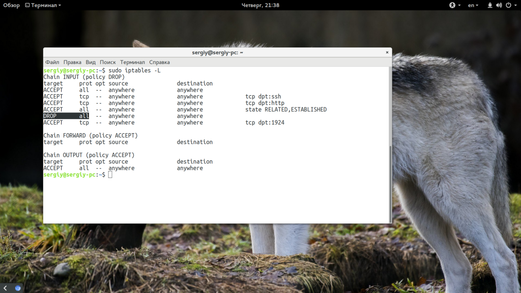 Чтобы все это в действительности заработало, осталось поменять политику по умолчанию на DROP: