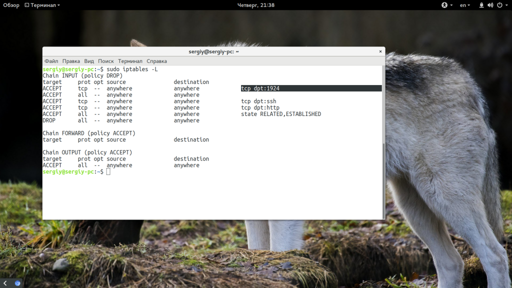 Здесь мы видим три цепочки OUTPUT, INPUT и FORWARD, за открытые порты отвечает цепочка INPUT, именно через нее проходят все входящие пакеты. Сейчас политика по умолчанию – ACCEPT, это значит, что подключение ко всем портам разрешено. Здесь нам нужно настроить все самим и это будет проще если бы какая-либо программа уже создала свои настройки, но этот вариант мы тоже рассмотрим ниже.