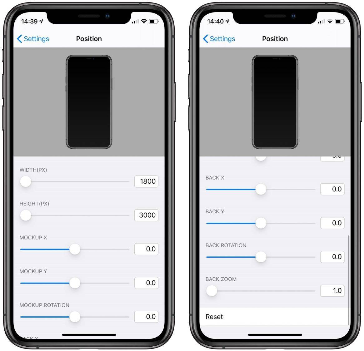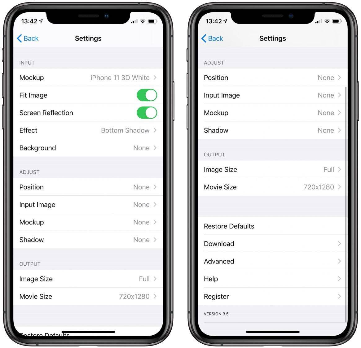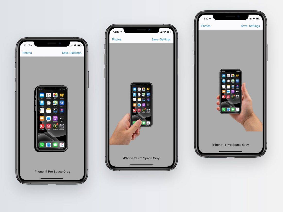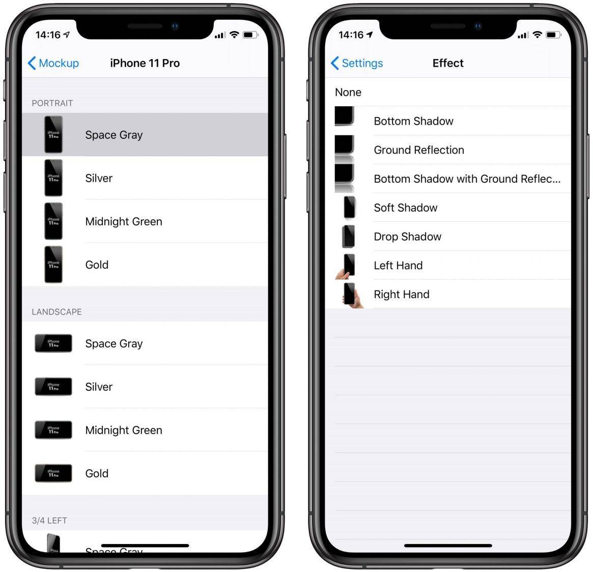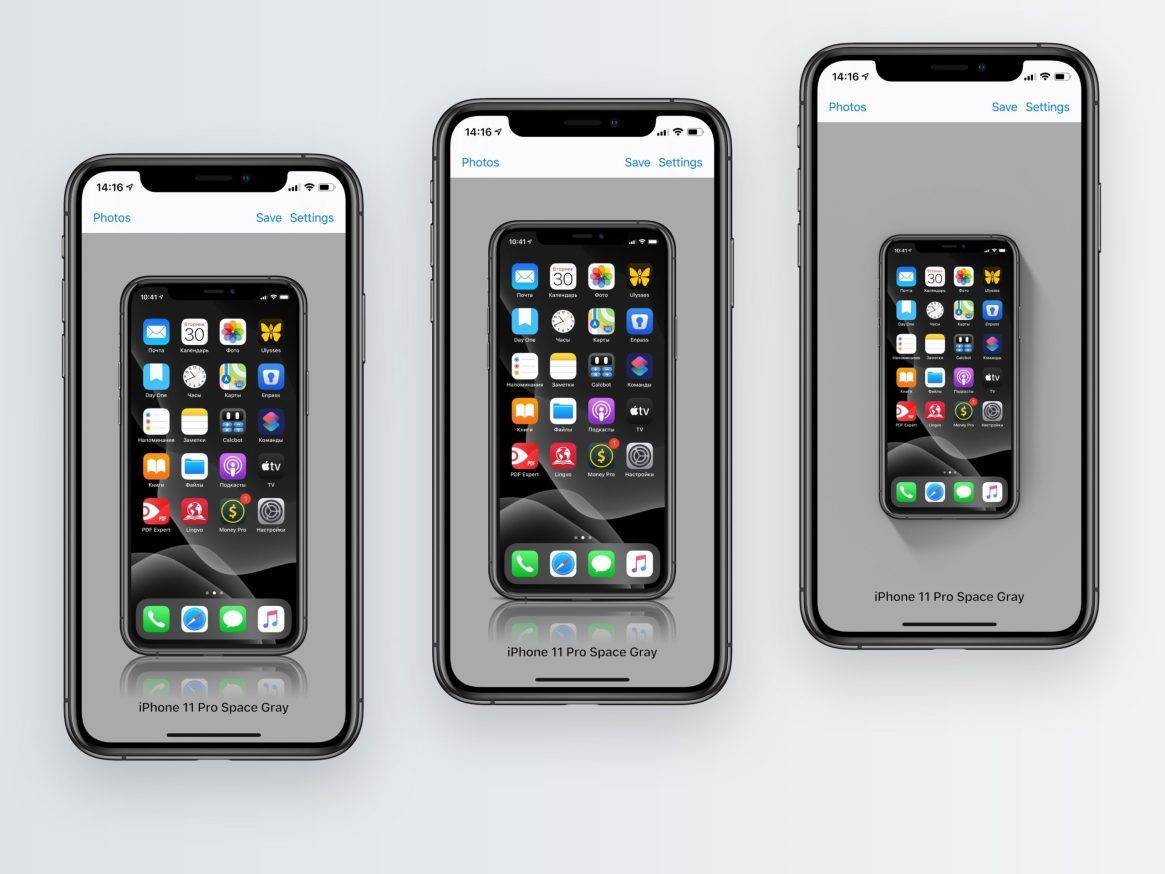 При создании скриншотов для iPhone 11 и выше, становятся доступны дополнительные опции теней (скриншотов), когда iPhone находится в руке, отображение крупной тени устройства и другие.