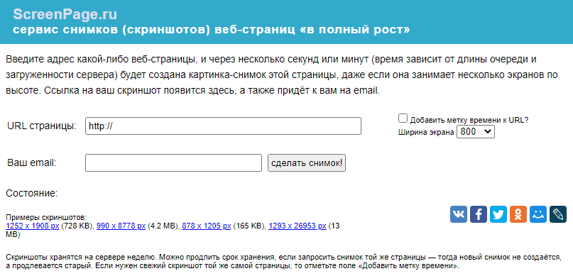 Чтобы сделать снимок экрана целиком всего сайта надо зайти на сайт screenpage, заполнить простую форму и получить результат. Для получения снимка экрана необходимо указать адрес электронной почты. Также сайт периодически падает, что дополнительно создает неудобства для пользователей.