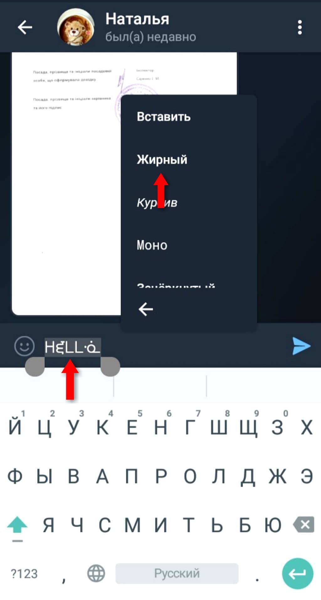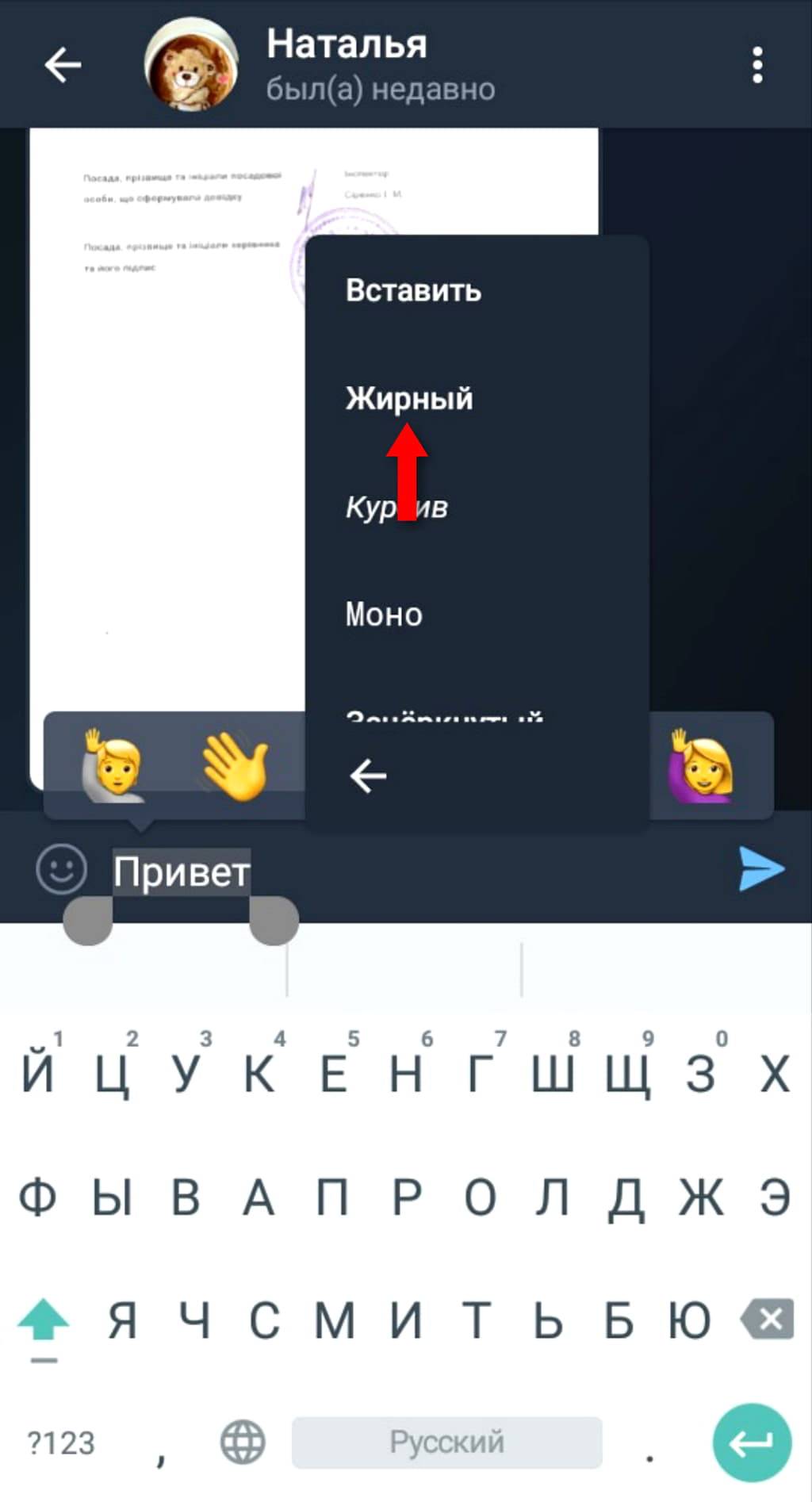 Первый предполагает выделение нужного фрагмента символами. Если в начале и конце слова поставить по две звездочки, то в послании оно отобразится с нужным начертанием. К примеру, написав в строке для ввода сообщения текст «**Привет**» (без кавычек), в переписке это будет отображаться как «Привет».