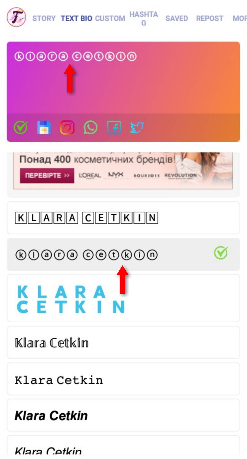 - Выбрать шрифт или готовую фразу.