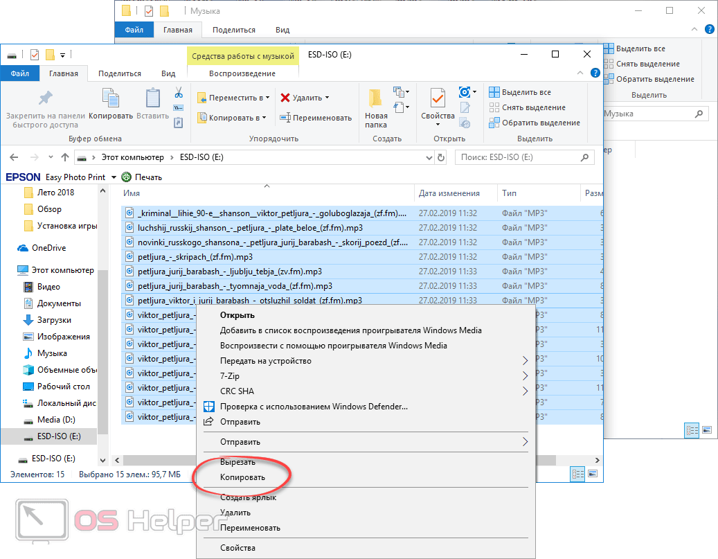 Выберите музыку, которую нужно скопировать. Зажмите левую клавишу мыши и проведите курсором над нужными музыкальным файлам, или зажмите Ctrl