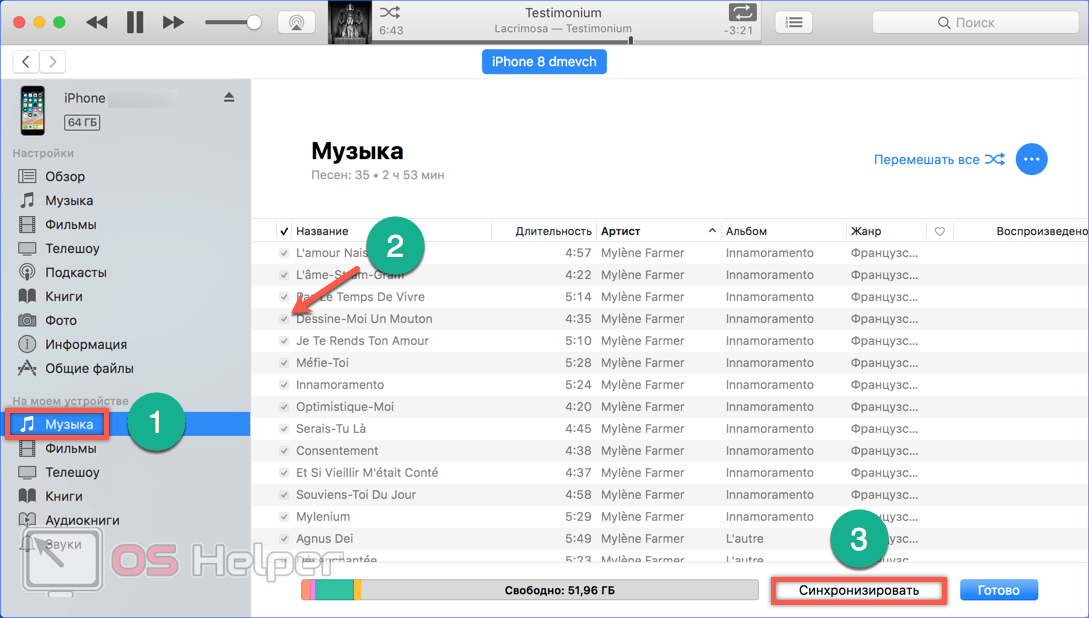 - Переходим к пункту «Музыка» в боковом меню. Чтобы убрать песни со смартфона, снимаем проставленные напротив них отметки. Оставив необходимое, завершаем синхронизацию по кабелю нажатием на отмеченную цифрой «3» кнопку.