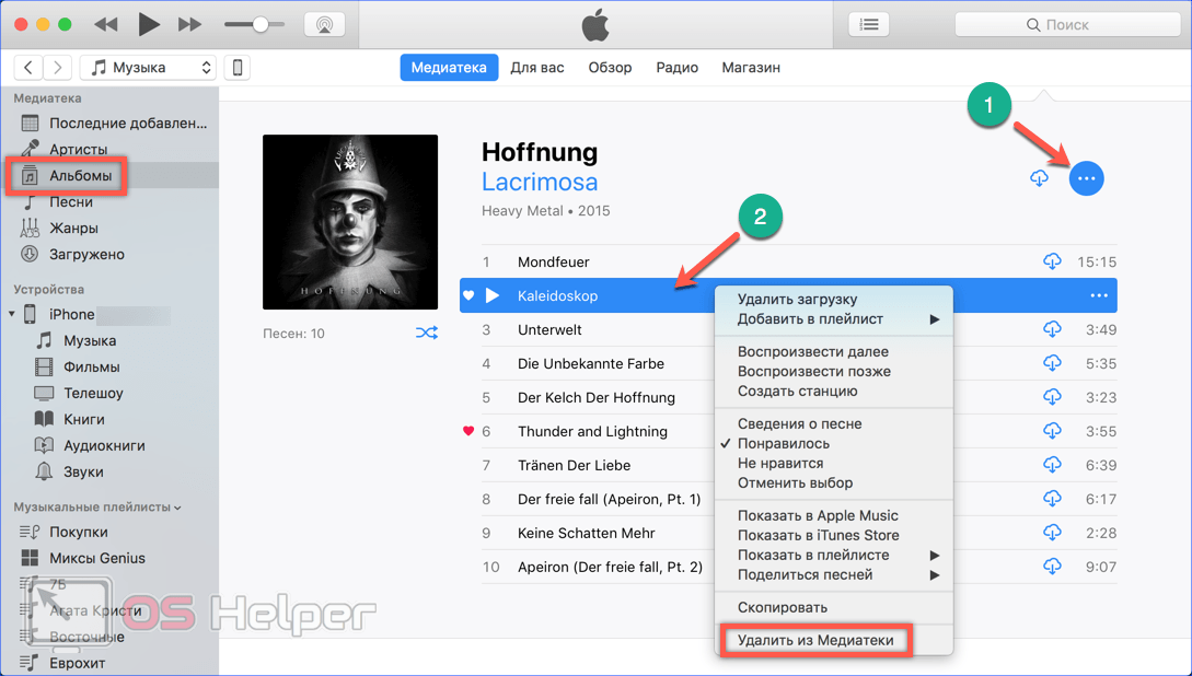 - Запустив iTunes, выбираем просмотр по альбомам, как мы делали на iPhone. Воспользовавшись меню, обозначенным цифрой «1», мы можем удалить его полностью. Цифрой «2» показано контекстное меню для отдельной композиции.