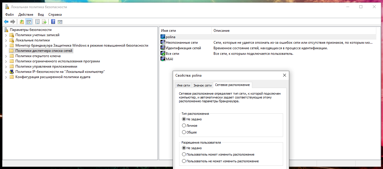 Другой способ изменить тип сетевого расположения — использовать редактор локальной политики безопасности. Запустите secpol.msc и перейдите в раздел Политики диспетчера списков сетей. Справа найдите свою сеть по имени, отображаемому в Центре управления сетями и общим доступом. Откройте свойства сети и перейдите на вкладку «Сетевое расположение», затем измените тип сети с «Не задано» на «Личное» и сохраните изменения. Чтобы запретить пользователям изменять сетевой профиль, выберите опцию «Пользователь не может изменить местоположение».
