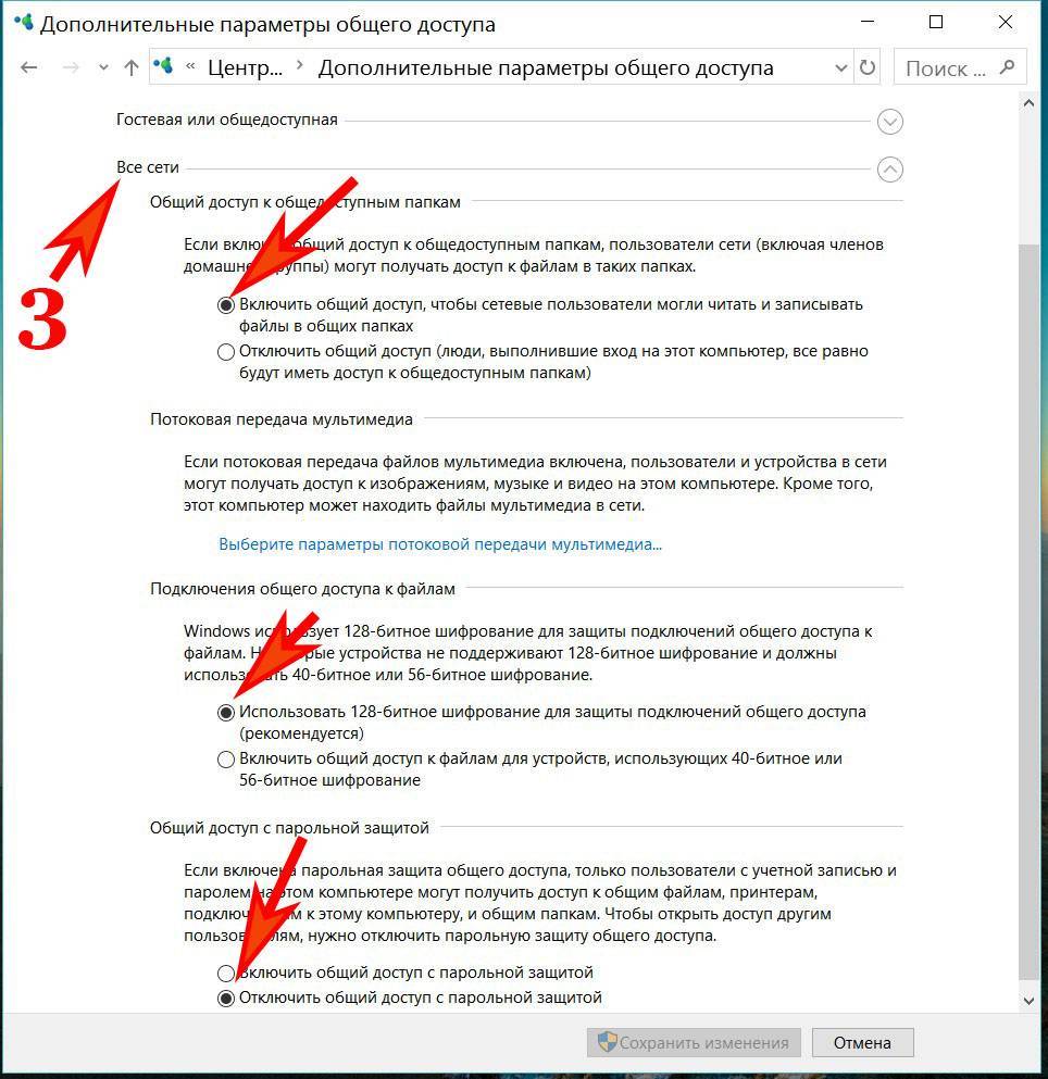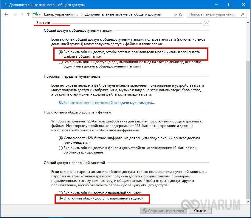 Теперь перейдите к профилю «Все сети» и включите (если отключены) общий доступ для сетевых пользователей, а парольную защиту, напротив, отключите.