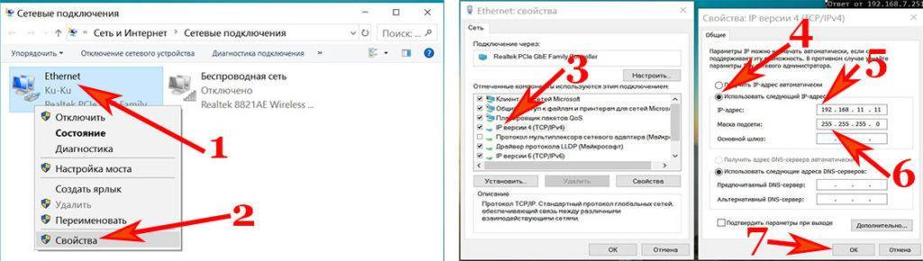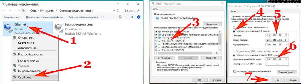 Кликаем правой кнопкой мыши на «Ethernet», далее «Свойство», кликаем двойным щелчком на строке «IP версии 4 (TCP/IPv4)».