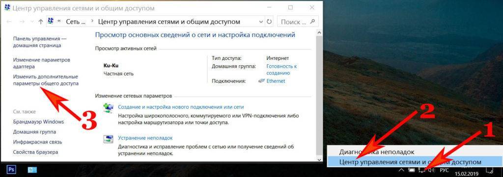 Клацаем левой клавишей мышки на иконку «Сеть», далее «Центр управления сетями….», «Изменить дополнительные параметры….».