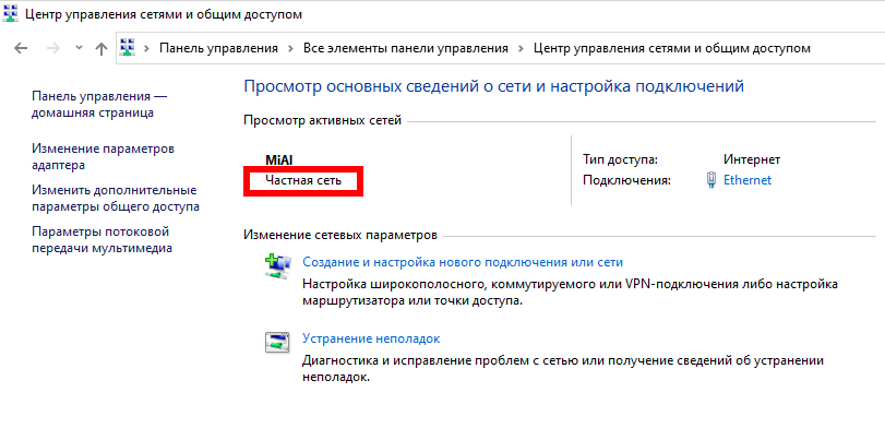 В Windows 8 вместо «Домашняя» появилась «Частная», а «Корпоративная сеть» вообще исчезла. Но здесь фокусировка на тип профиля в один клик не работает, поэтому изменение параметра на нужный производится редактированием реестра.
