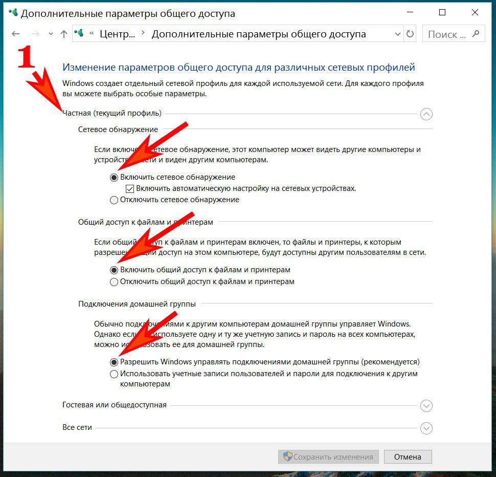 Откройте командой control /name Microsoft.NetworkAndSharingCenter «Центр управления сетями и общим доступом», зайдите в дополнительные параметры и убедитесь, что тип сети у используемого вами сетевого профиля «Частный». Далее проверьте, чтобы в настройках профиля были включены сетевое обнаружение, доступ к файлам и принтерам, а также имелось разрешение Windows управлять подключениями домашней группы.