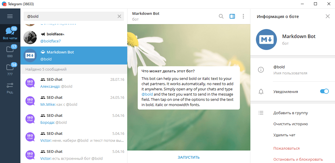 Если вы все сделали правильно на предыдущем этапе, то бот должен обнаружиться в результатах поиска и нормально работать.