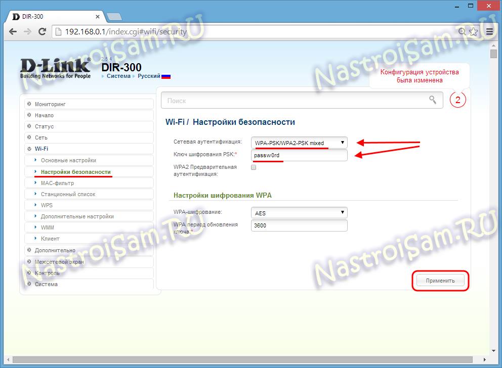 В поле «Ключ шифрования PSK» надо ввести пароль на Ваш Wi-Fi и применить настройки.