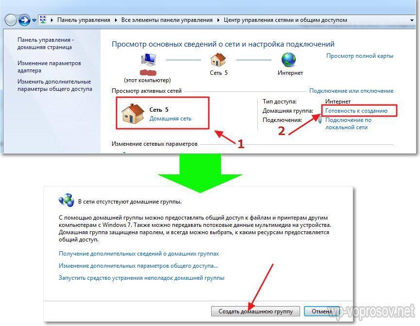 Заходим в «Пуск — Панель управления — Центр управления сетями и общим доступом». Находим подзаголовок «Домашняя группа» и жмем на ссылку «Готовность к созданию», а потом на кнопку «Создать домашнюю группу».