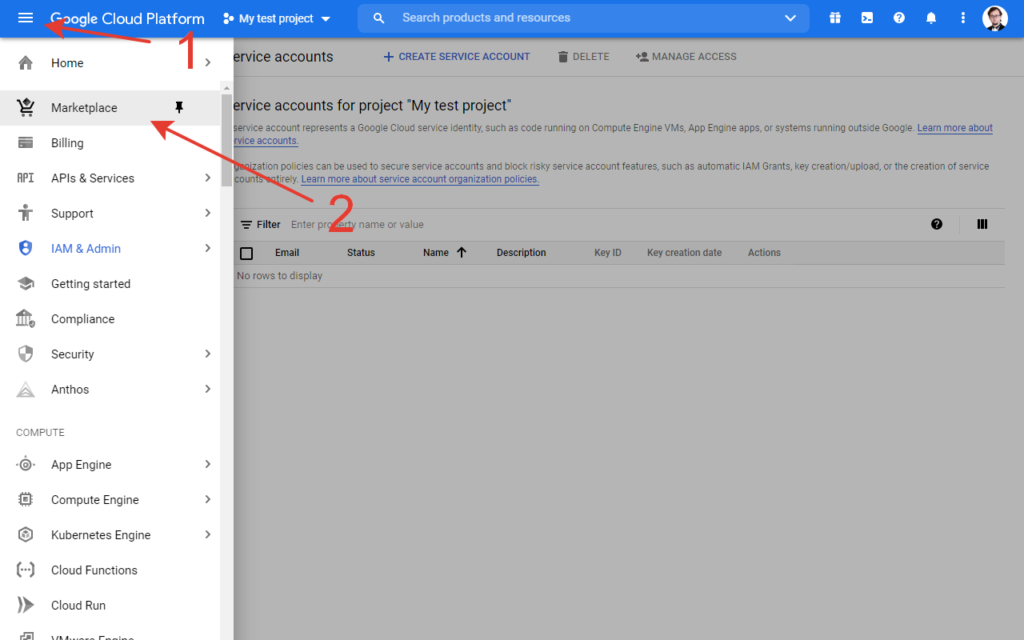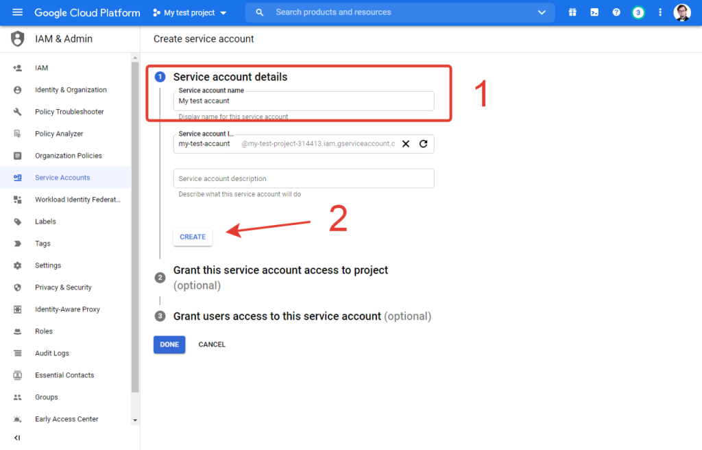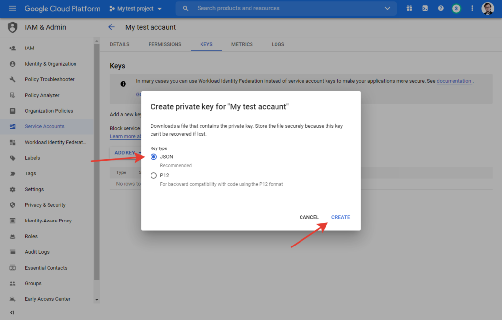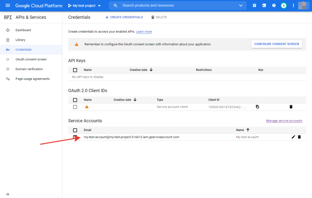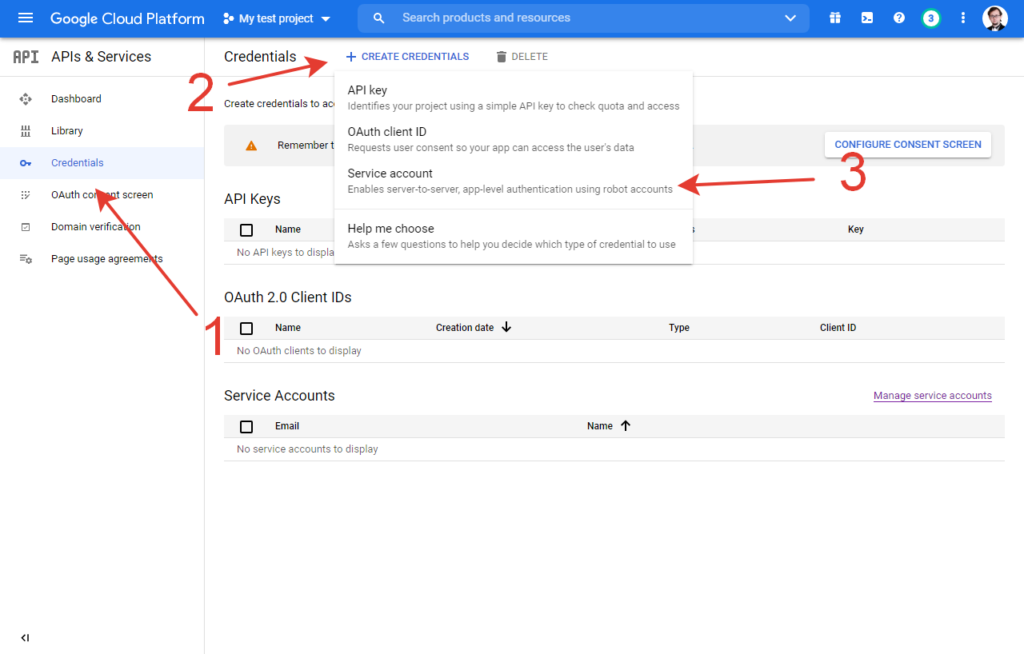 Слева в меню перейдите в “Credentials”. Нажмите на “Create Credentials”, в открывшемся меню выберите пункт Service account.