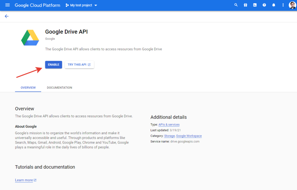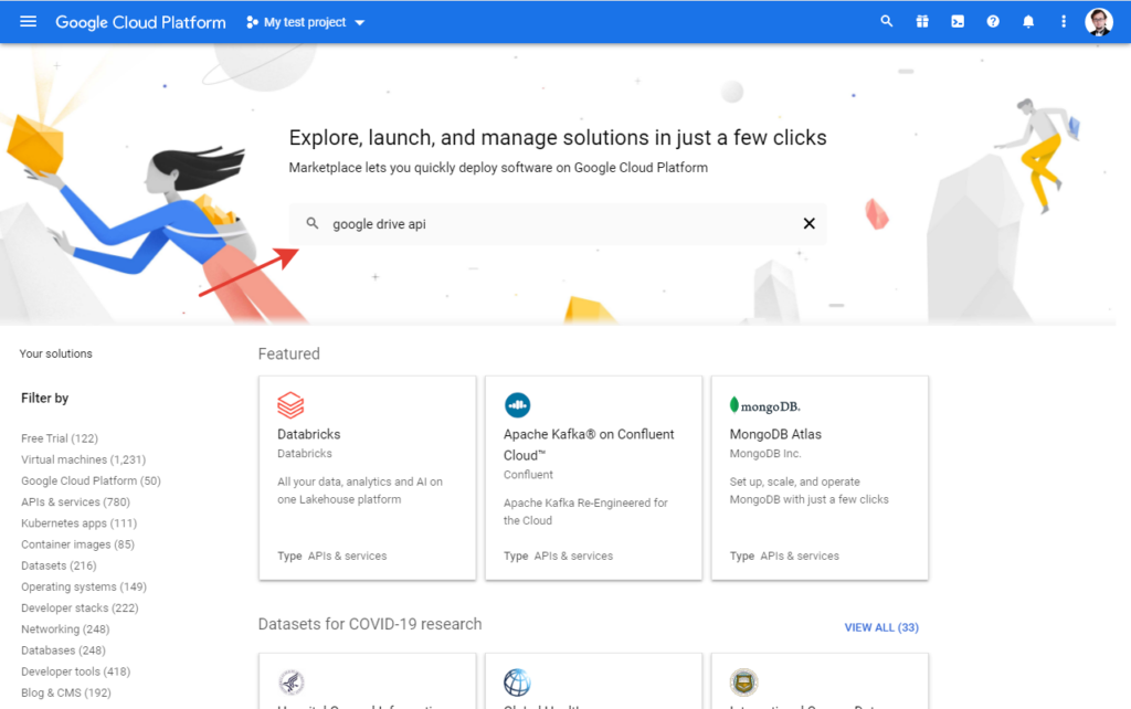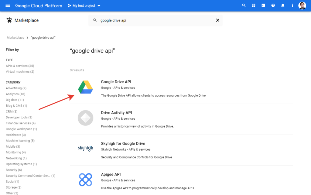 В поле поиска введите “Google Drive api” и нажмите на Enter.