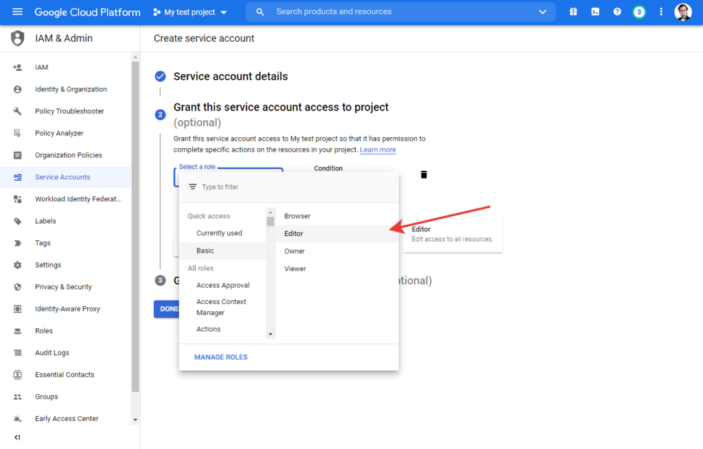 В поле “Select Role” выберите “Editor”. Затем нажмите Continue.
