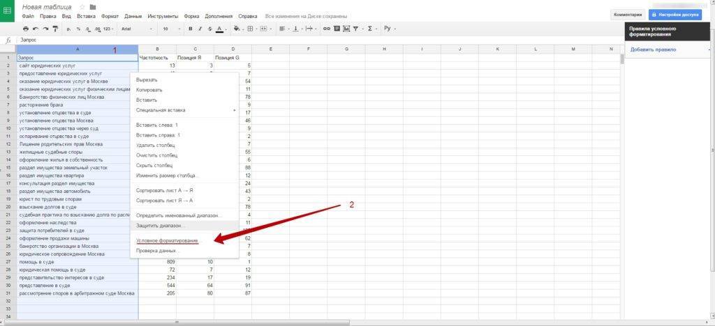 Знакомимся с набором функций редактора, просматриваем меню. Встречаем “знакомых” из “Excel”, что делает работу приятной и легкой. Основное меню и контекстное в чем-то совпадают. Хотя список функций в “Эксель” намного шире, но даже того, что сегодня предлагает “Гугл”, хватает чтобы не чувствовать дискомфорта.