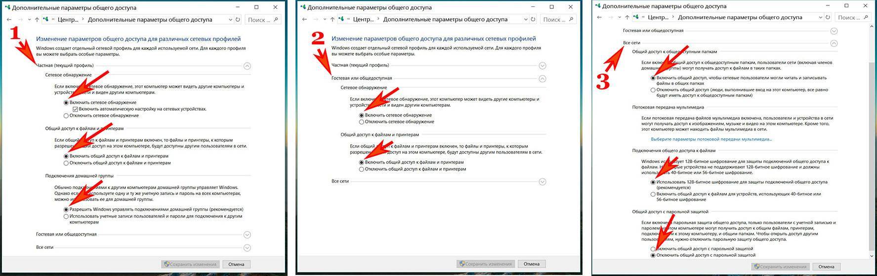 Важно! Теперь нам нужно везде пометить галочками и кружочками, что мы включаем общий доступ к файлам и принтерам, включаем сетевое обнаружение, а так же отключаем общий доступ с парольной защитой! Если не сделать эти настройки, общий доступ к папкам вы не сможете предоставить. Здесь стоит быть внимательным, т.к. чаще всего тут присутствуют три вкладке, в каждой из которой нужно включить эти галочки!