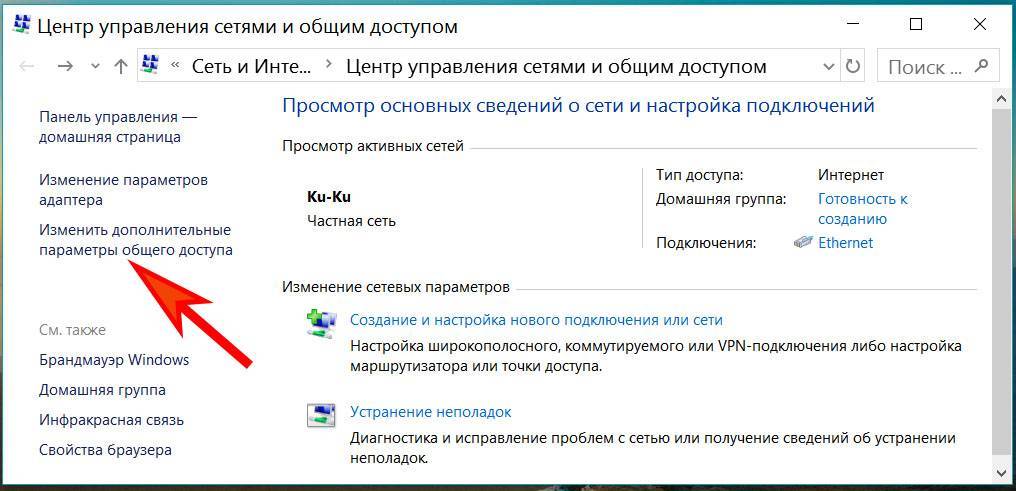 В колонке слева, найдите и откройте «дополнительные параметры общего доступа».