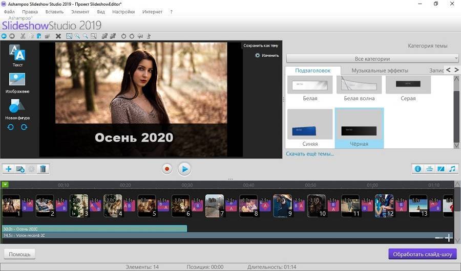Эта программа работает на русском языке и позволяет создавать яркие видеоклипы с музыкой c нуля или по готовым шаблонам. В ФотоШОУ PRO вы сможете оживлять фотографии, добавлять переходы для стильной смены слайдов, накладывать анимированные эффекты, музыку или проводить озвучку голосом.