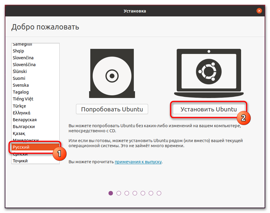 - Выберите в меню русский язык и нажмите «Установить Ubuntu».