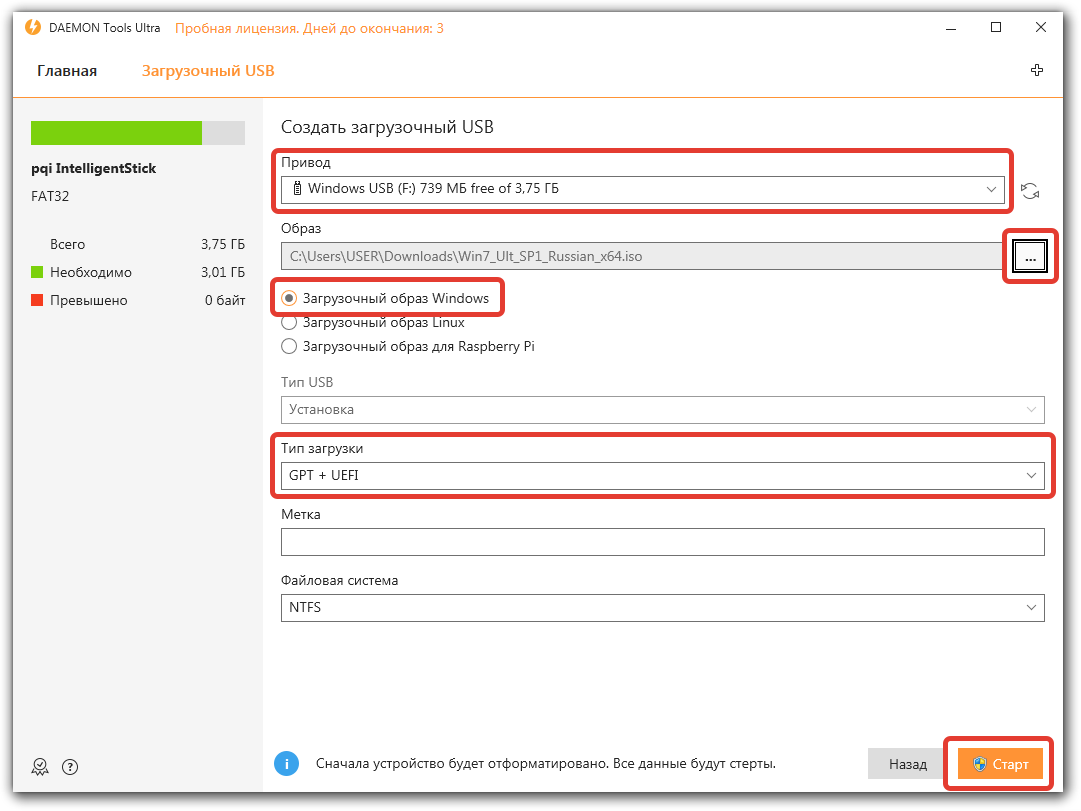 Перед тем как следовать моим рекомендациям, проверьте, чтобы на вашей флешке не было никаких нужных данных, так как для того чтобы создать загрузочный USB, Windows 7, как и любая другая операционная система, требует пустой отформатированный носитель. Удалить всю информацию с флешки можно как из DAEMON Tools Ultra, так и самостоятельно.