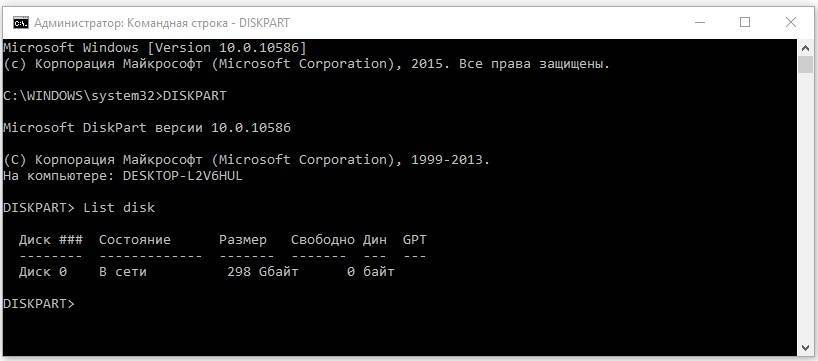 Скриншот 1. Отображение в окне утилиты DISKPART списока доступных дисков