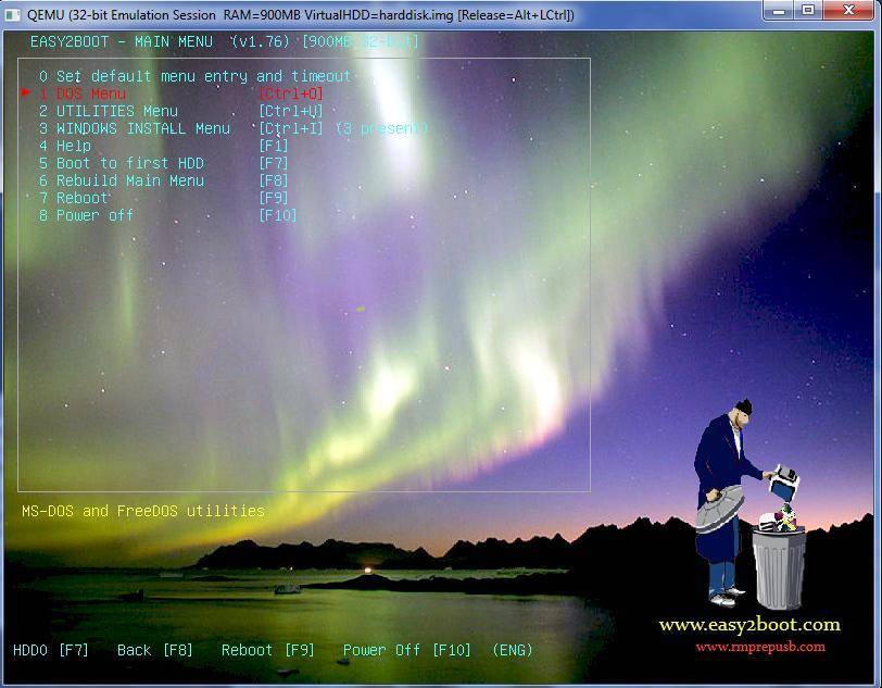 После того как образы запишутся на USB накопитель, необходимо сделать последнюю операцию, нажав комбинацию клавиш Ctrl + F2. Через пару минут ваш мультизагрузочный накопитель будет готов. Проверить его работоспособность можно во встроенном эмуляторе RMPrepUSB. Чтобы его запустить, нажмите клавишу F11. После нажатия кнопки начнётся загрузка эмулятора с вашим накопителем и через несколько минут вы увидите меню загрузчика.
