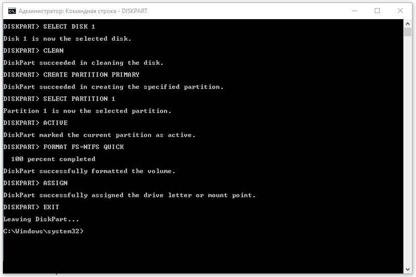 Форматируем. format fs=NTFS. Если не хочется ждать и время поджимает, то делаем быстрое форматирование командой format fs=NTFS QUICK