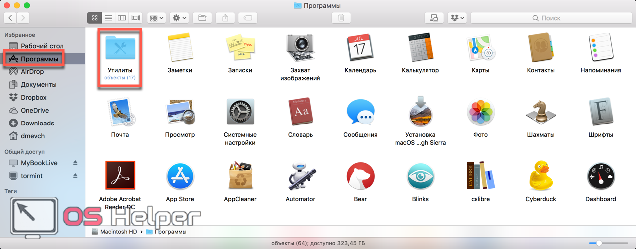 - Открываем Finder и в области навигации выбираем «Программы». Открываем отмеченную на скриншоте папку.