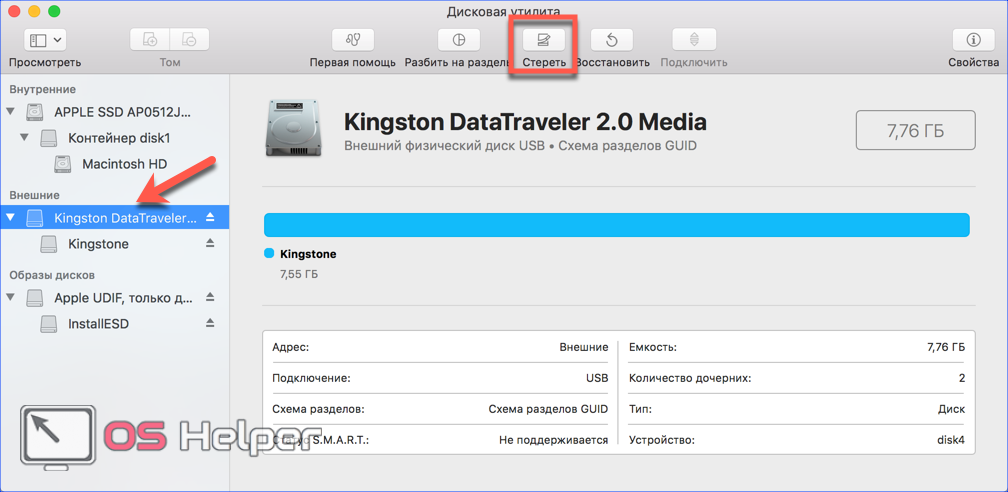 - Ищем внешние диски. Выбираем заданное производителем название флешки, выделяя ее. В верхнем управляющем меню активируется кнопка «Стереть». Нажимаем на нее, чтобы открыть следующий диалог.
