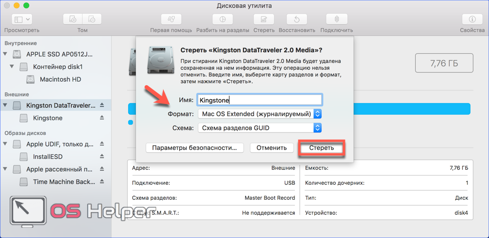 - В правой части окна нажмите на закладку «Стереть» и очистите диск, использовав Mac OS Extended (журнальный).