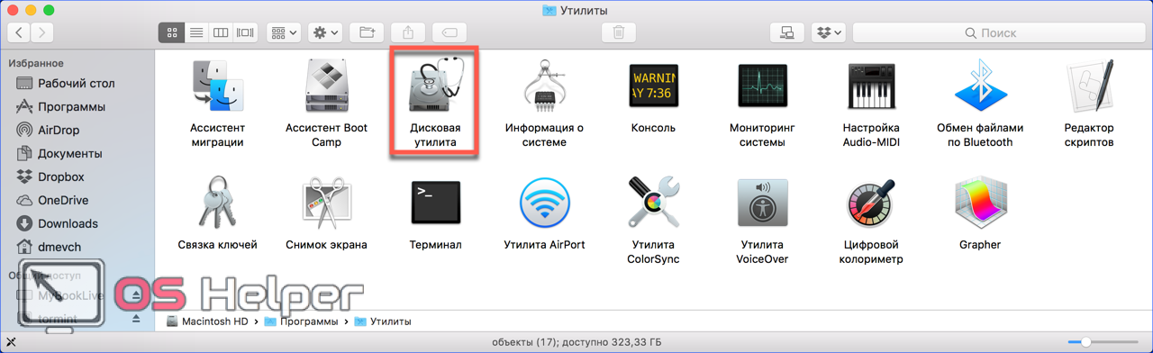 Форматирование в macOS выполняется с помощью дисковой утилиты. Найти ее можно, открыв Launchpad в папке «Другие» или воспользовавшись Finder. Выберем второй вариант, как более удобный. Флешка традиционно для современных ОС должна быть не менее 8 Гб.