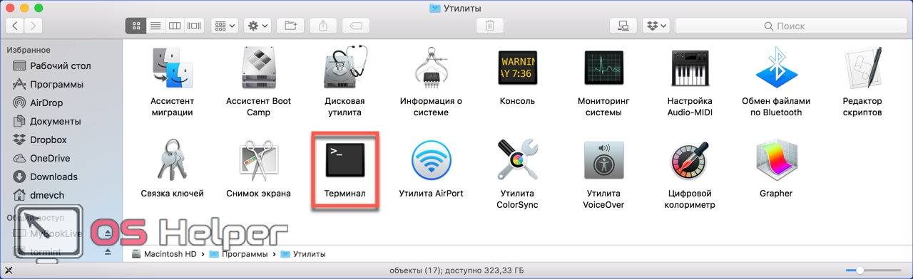 - Возвращаемся в папку «Утилиты» и запускаем «Терминал».