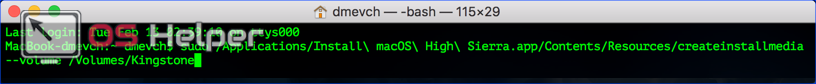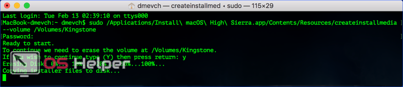 sudo /Applications/Install\ macOS\ High\ Sierra.app/Contents/Resources/createinstallmedia —volume /Volumes/Kingstone