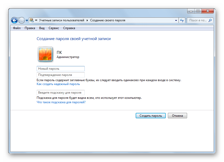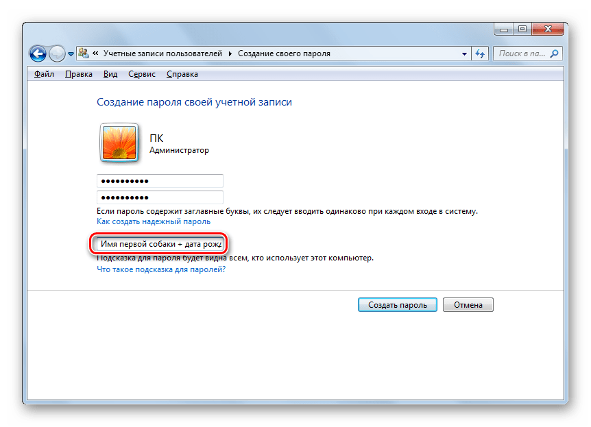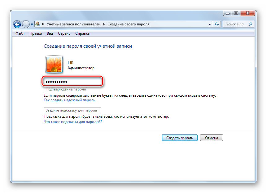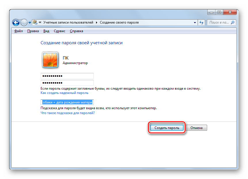 Далее, вам нужно его подтвердить. При этом, учитываются заглавные буквы. Если у вас все же имеются опасения, что вы можете забыть пароль, вам необходимо ввести в третью строку подсказку для этого пароля, которую вы придумаете сами. Но учтите, её увидят все пользователи. Нажимаем «Создать пароль».
